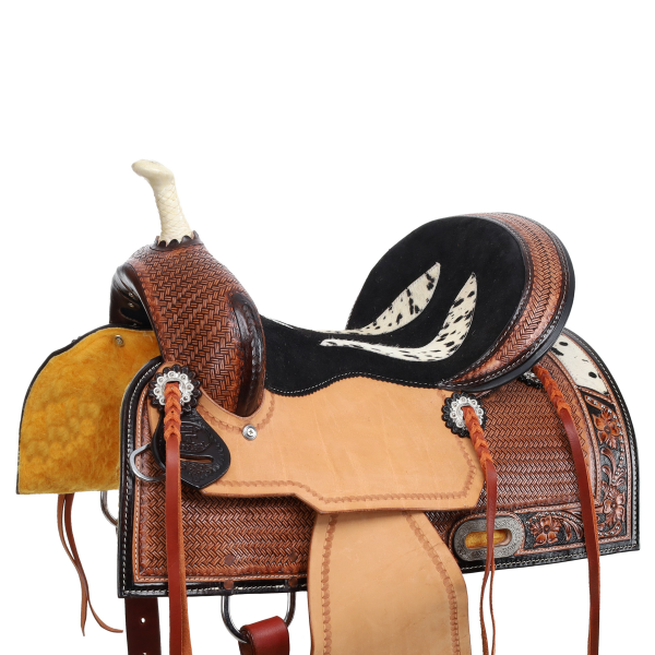 The medium oiled pommel, cantle, and skirts showcase intricate bamboo and floral tooling, adding a unique, elegant touch. The hair-on cowhide inlay on the skirt creates a bold, rustic contrast, making this saddle a true standout in and out of the arena. A black suede seat with a hair-on cowhide stitched overlay not only enhances comfort but also adds a touch of rugged charm.
