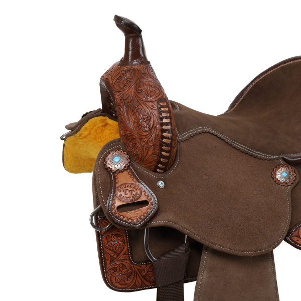 The Double T® Kassidy Spinal Relief Barrel Style Saddle combines functionality, comfort, and striking Western style. Made with premium chocolate roughout suede leather, this saddle provides superior grip and durability, ideal for barrel racing and competitive riding. The chocolate leather accents on the skirt, pommel, and cantle are adorned with medium oiled floral tooling, giving the saddle an elegant and refined appearance.