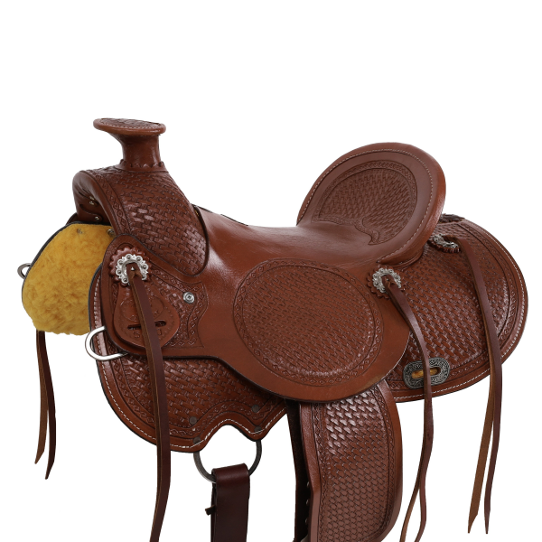 - Intricate basket tooling adorns the saddle with a detailed basket weave pattern, adding depth and texture.