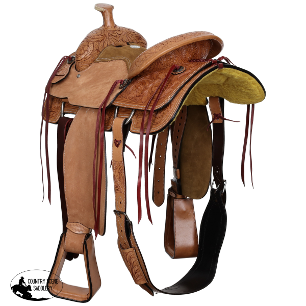 Designed for comfort and functionality, the honey brown suede padded seat provides a secure, comfortable ride, while silver bar antiqued slotted conchos paired with burgundy saddle strings add rich contrast and detail. Complete with a leather tie strap, off billet, and rear rigging, this saddle is ready for everyday roping, ranch work, or long hours in the saddle.