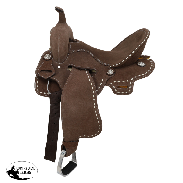 The Double T® Patsy Spinal Relief Barrel Style Saddle is thoughtfully designed to deliver unparalleled comfort, performance, and style for barrel racing and other riding disciplines. Crafted from durable ashy brown roughout suede leather, this saddle features classic white buckstitch trim, giving it a refined Western aesthetic. Its standout feature is the spinal relief contoured skirt, which offers full relief along the horse's spine, helping to prevent spine-related injuries and ensuring maximum comfort during every ride.