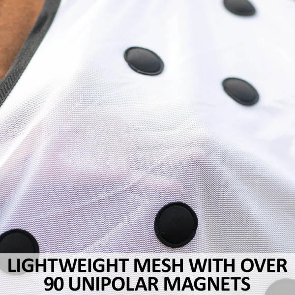 - Lightweight Mesh with Over 90 Unipolar Magnets This magnetic therapy sheet is crafted from lightweight mesh (350D) and designed with an open front, surcingle closure, and hind leg straps for a secure fit. It's fitted with over 90 strategically positioned unipolar neodymium magnets, providing optimal penetration at a level of 570 GAUSS, which is considered low to medium. Each magnet is securely sewn into a neoprene pocket. The therapeutic horse sheet is machine washable in cold water on a gentle cycle and should be line-dried.