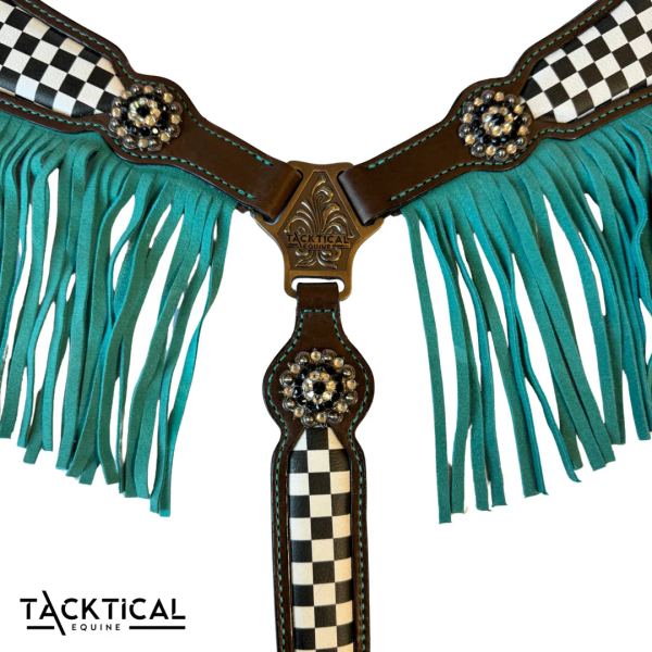 Featuring rich turquoise fringe and vintage-style concho detailing, this breastcollar combines function and fashion for riders who value both performance and personality in their tack. Whether you’re out on the trail or in the arena, this eye-catching piece ensures your horse stands out in true Western style.
