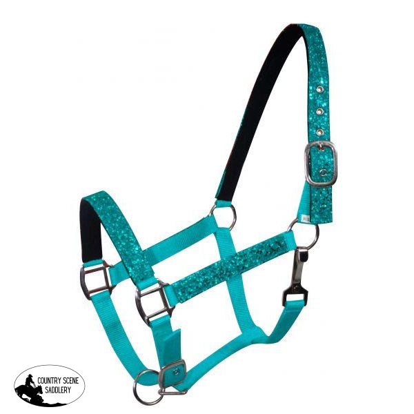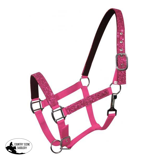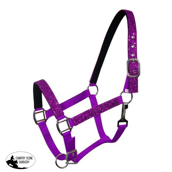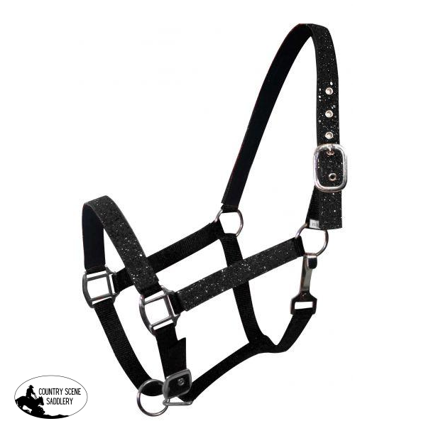 PonyΒ size nylon halter with neoprene lined nose and crown. Accented with glitter overlay on cheeks, nose and crown. Halter has eyelets on crown and adjustable nose and throat latch