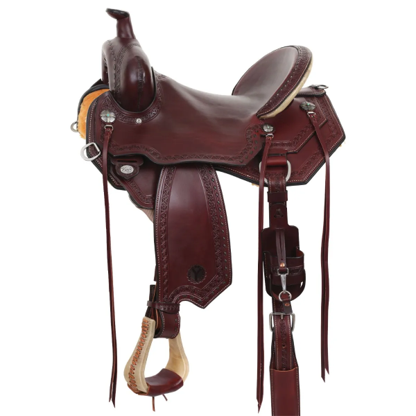- Key Features:A cutout skirt for precise cueing; Hardseat; softee seat jockeys for broken in feel; rawhide 2 piece cantle; Buckstitch detailing; Chestnut leather, water bottle holder