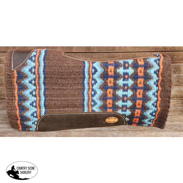 Brown and turquoise colored memory felt bottom saddle pad. This pad features a brown and turquoise durable woven wool top with reinforced leather spine and over sized top grain wear leathers with a 3/4" memory foam felt bottom. Pad is contoured to fit your horse.