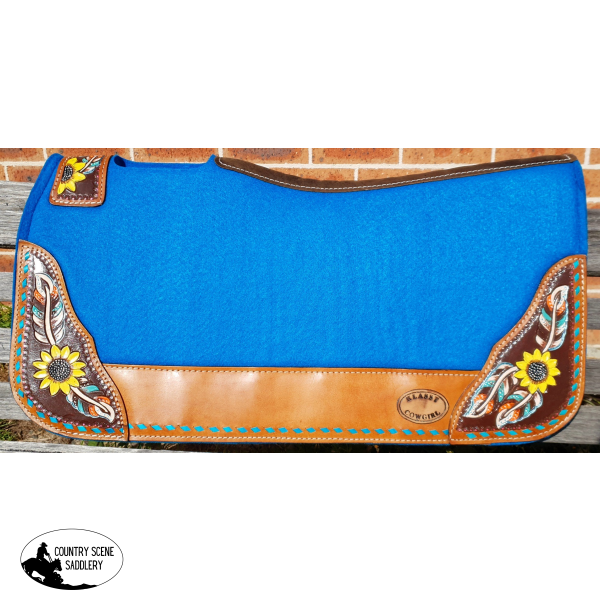 Klassy Cowgirl 28x30 Barrel Style 1” blue felt pad with blue lacing and painted feather & sunflower design. This beautiful pad features a distressed brown leather with blue lacing, and painted feather and sunflower design. This saddle pad features a 1" heavy duty blue felt with vented wither and leather reinforced spine