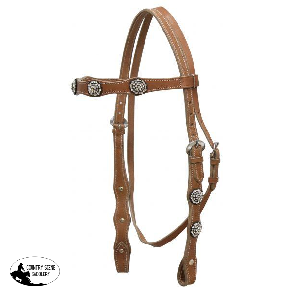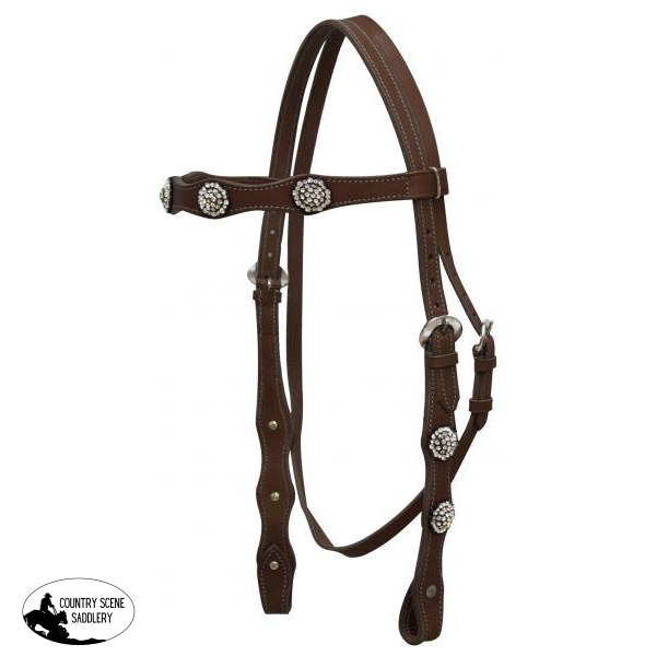 Leather double stitched headstall with clear rhinestone conchos. Features double buckle adjustment and clear rhinestone conchos on browband and cheeks. Comes with 5' leather split reins.