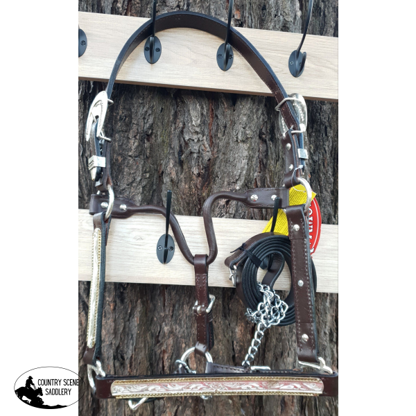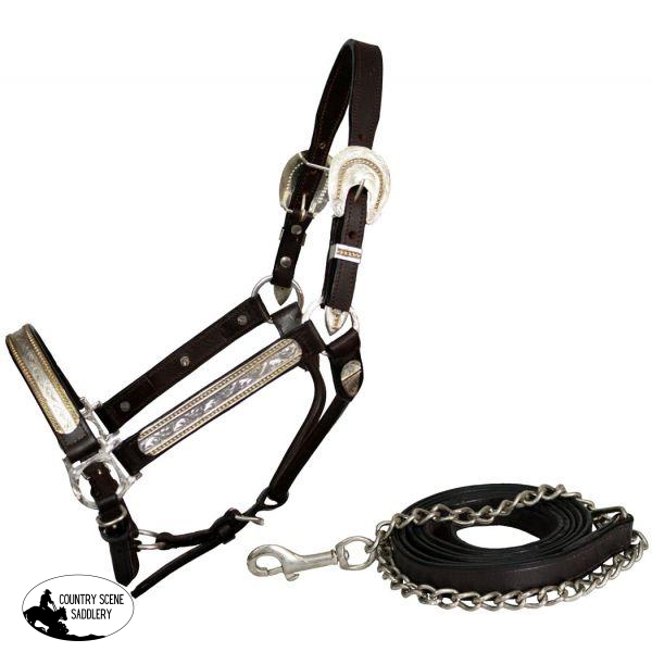 Showman ® leather full horse size silver show halter. Halter features double buckles on crown and three way adjustable nose and throat latch. Halter has silver and gold on noseband and cheeks with raised gold beading on edges. Comes with 3/4" x 6' leather lead with stud chain. Made by Showman™ Products