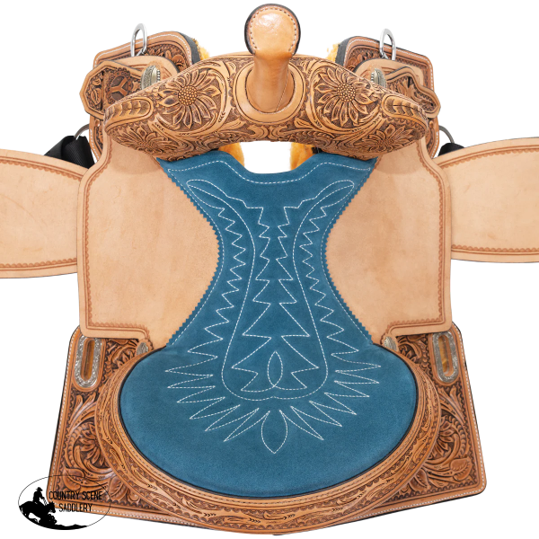 For barrel racers who demand both functionality and style, the Maisle Freedom Fit Barrel Saddle delivers on every level. The Freedom Fit wood tree has the unique advantage of a narrow seat twist specifically for female riders to feel comfortable and aligned in the saddle. Designed with a wide swell and a tall 5” cantle, this saddle ensures you stay in the ideal position through powerful turns. The Maisle makes a bold statement with its intricate sunflower hand tooling, ensuring you shine in the arena. Choose between a striking blue suede seat or a sleek jet-black suede to match your energy and set the tone for your ride. Getting the right fit for your horse is just as important to us as it is to you. Here’s what we generally recommend: • Regular tree fit: Ideal for horses with more defined withers. • Wide tree fit: Perfect for horses with a foundation build and rounder withers. • Extra Wide tree fit: Perfect for horses with a wide build and and round withers.