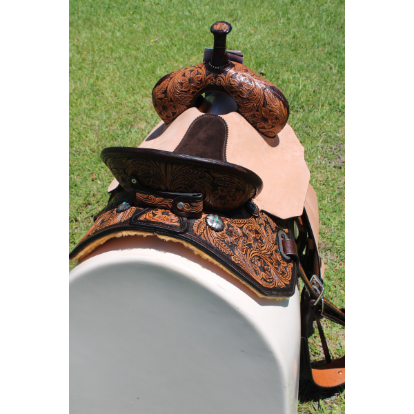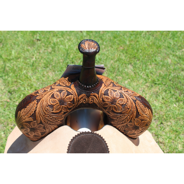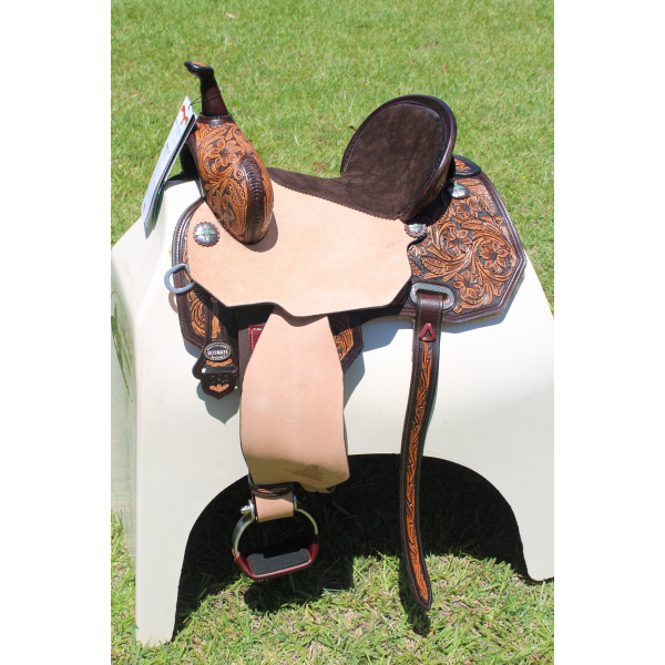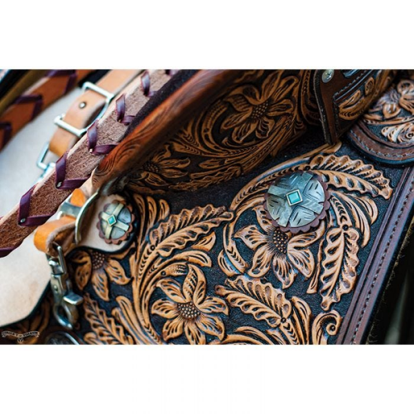 The MJ50 Josey Cash Rancher has the tree riders love with a taller, 9” swell and 5” cantle, providing an extra secure seat to keep the rider in the correct position. Beautiful floral tooling pops in a vintage finish and pencil roll cantle lend a punchy ranch look. The chocolate suede seat and contrasting roughout fenders provide style and grip for a secure seat in tight turns. Rear cinch set included.