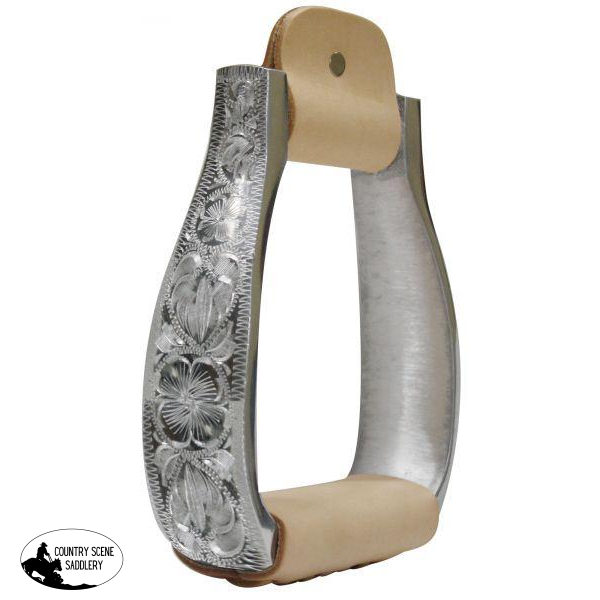 Polished aluminum engraved stirrups with 3" neck, 4.75" wide and 2" tread.