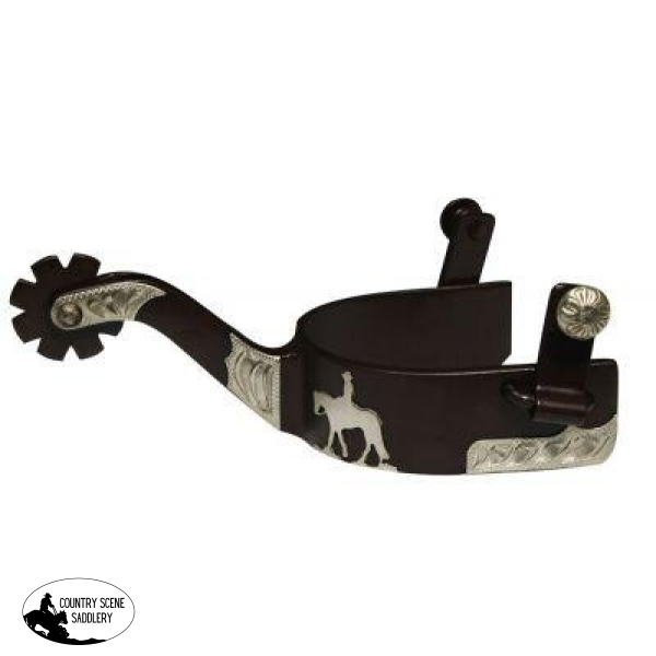 Showman™ brown steel spur with 1.25" band and 3.25" shank. Details are engraved silver accents and horse & rider emblem. Made by Showman™ Products.
