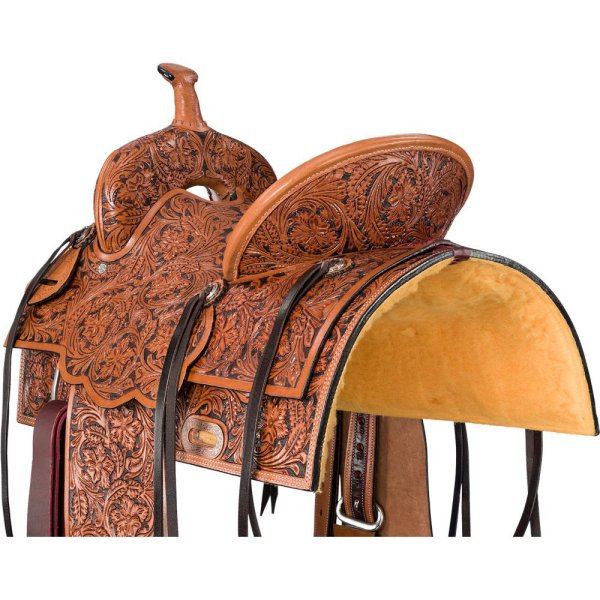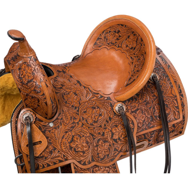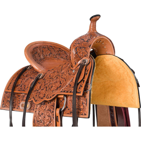 The Prescott evokes the feel of the “good old days” with its elegant floral all-over hand tooling and vintage copper conchos. Built for durability and style, this all-around saddle is perfect for riders who appreciate both tradition and practicality. The hard seat with a pencil roll cantle provides a secure and balanced ride, while in-skirt rigging offers close contact and stability.