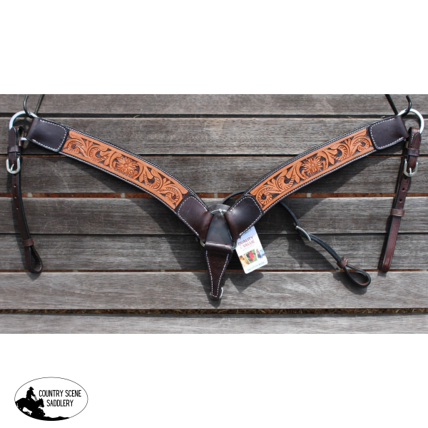 LeatherHand carved toolingStainless Steel hardwareAdjustable tugsAdjustable center strap with snapChest Piece(one side): 2" wide x 14 1/2" long, Tug Straps: 7"-11", Center Strap: 20"-22" Pre Order USA