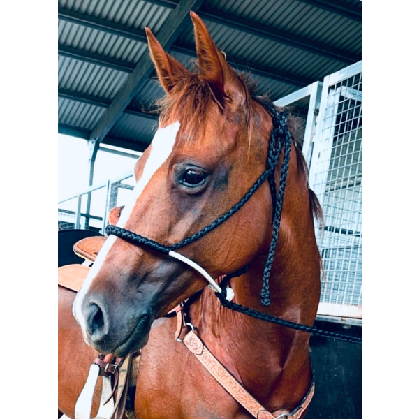 The Ruby Rose Cowboy halter is made using a lariat nose and with mule tape halter and 8βlead