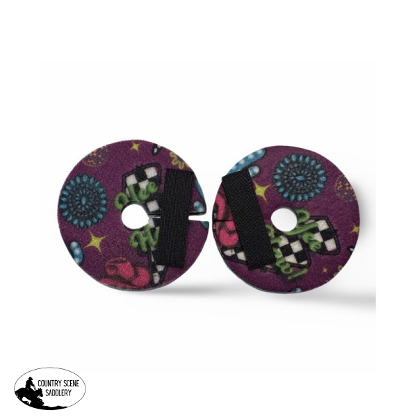 Neoprene bit guard with velcro closure. 3.25" diameter with .5" center hole for bit 5mm thick in our vibrant Vegas Rodeo print. Sold as a pair.