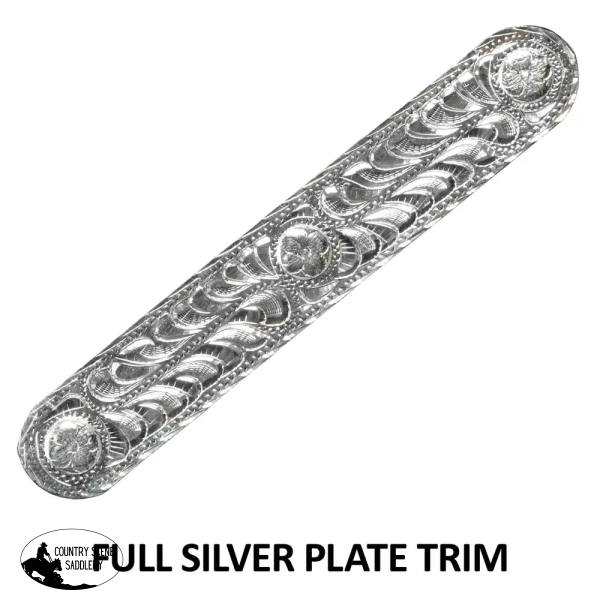 The full silver plating over the nose and cheeks is designed to stand out in the show pen and show off your horse's head with this beautifully made show halter and matching leather lead. Cheek buckle measures 2 1/4" wide x 2 5/8" tall with matching keeper at tip.