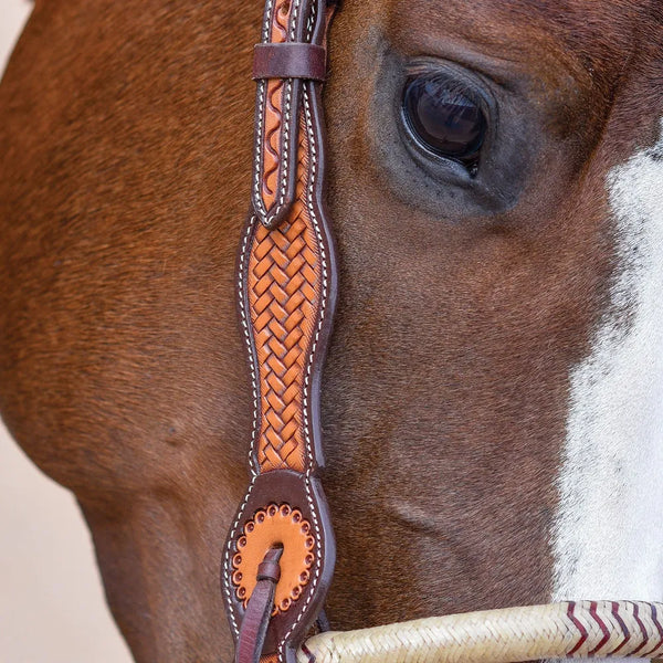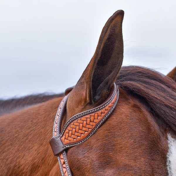 - Basketweave tooled light browband bridle with dark trim