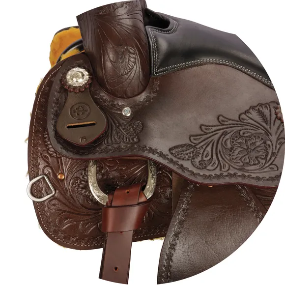 This western show saddle is exquisitely hand-tooled and versatile enough for shows, daily work, or trail riding. The lightweight fiberglass tree comes with a 5-year warranty, while the full horse bars accommodate most modern conformations. Our show saddle also features a gorgeous floral tooling pattern with a barbed wire border, smooth leather fenders, skirt jockey, and generously padded seat, ensuring both comfort and style.
