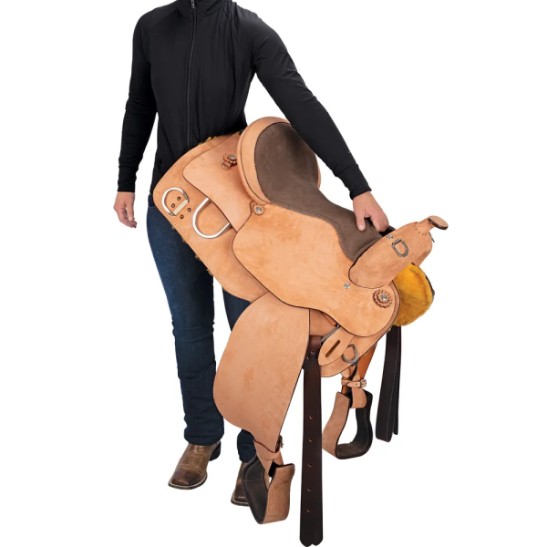 This Western work saddle is a top choice for those seeking performance, quality, and affordability in a saddle. It's versatile and perfect for training, trail riding, or working on the ranch, thanks to its wooden, reinforced fiberglass tree, semi-quarter horse bars, and close-contact fender. The total roughout design adds 'stick' and security for riders while training or working, while the nicely padded roughout seat puts the rider in the right position for optimal control.