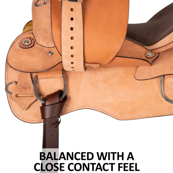 - Balanced With a Close Contact Feel The cut-out fenders were designed with a close contact feel in mind to improve communication between you and your horse. Plus, the padded roughout seat offers all-day comfort and balance.