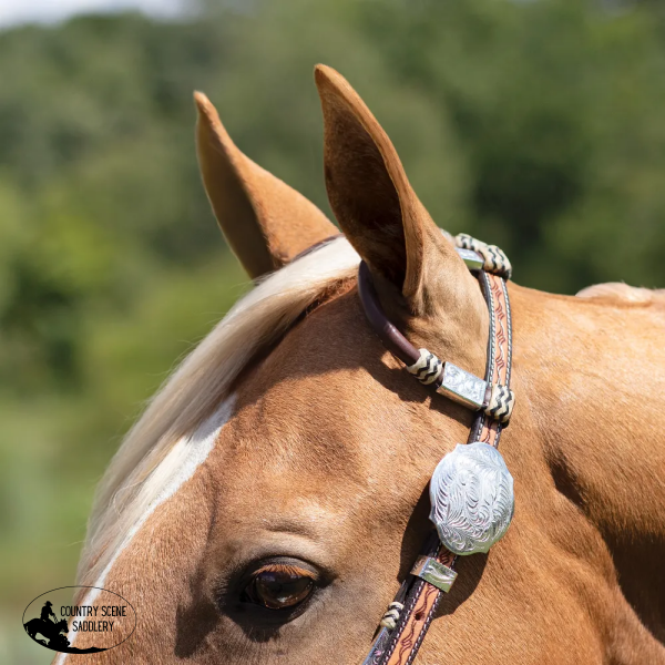 Schneiders® Two Ear Tooled Show Headstall with Rawhide Accents Turn heads in the show ring with our Two Ear Tooled Show Headstall with Rawhide Accents. Crafted from supple Argentine leather in a rich contrast of dark and light tones, this headstall features intricate ribbon tooling and eye-catching silver plate squares. Natural rawhide with black accents completes the elegant design, while the rolled two-ear piece and Chicago screw bit ends keep things functional and polished for every performance.
