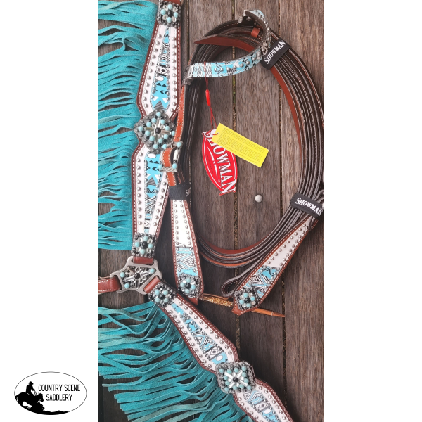 Showman ® " Arctic Aztec" Headstall and breast collar set. This set features medium leather with a light blue, white and black Aztec design and bejeweled conchos and hardware. Breast collar is accented with light blue suede leather fringe. Headstall comes with 5/8" x 7' leather split reins.Matching rope halter #16292
