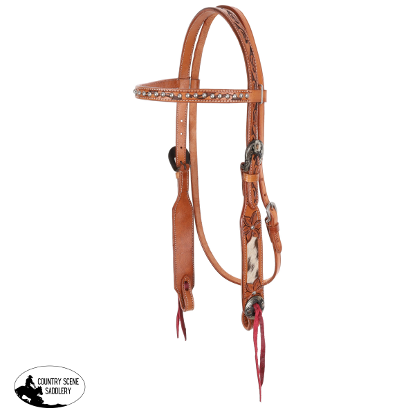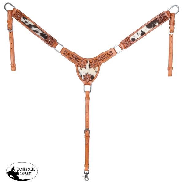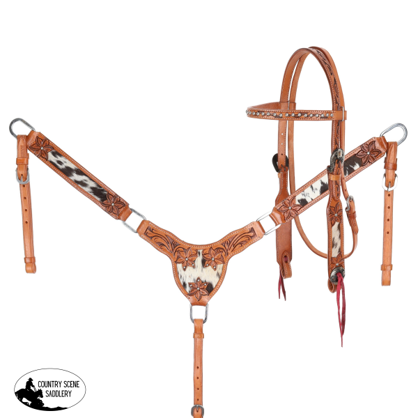 Designed for riders who appreciate both style and function, this set features a medium oiled floral tooled leather base, offering a rich, classic look. The striking hair-on cowhide inlays add a unique and rugged touch, making this set a standout piece in any tack collection. Silver stud accents line the headstall and breastcollar, enhancing their visual appeal with a bold, refined look.