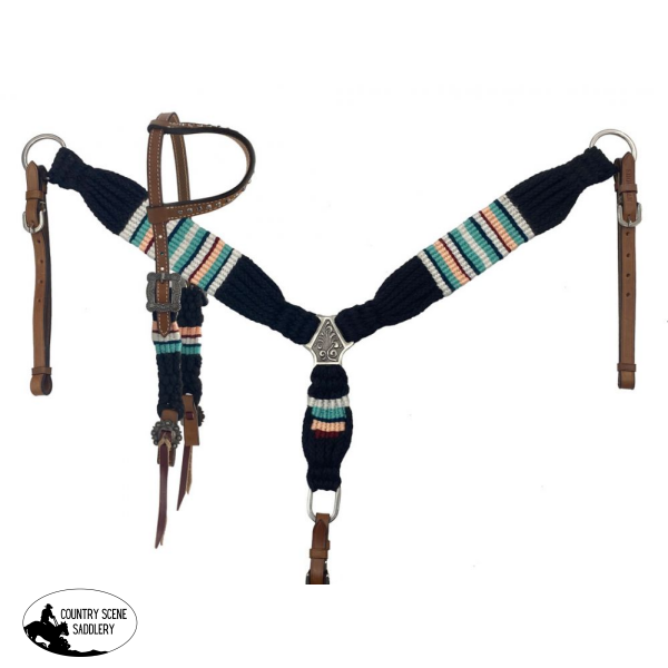 Showman ® Corded One Ear Headstall & Breast collar set. This set features a medium leather with southwest design. Set comes complete with matching headstall, and breast collar.