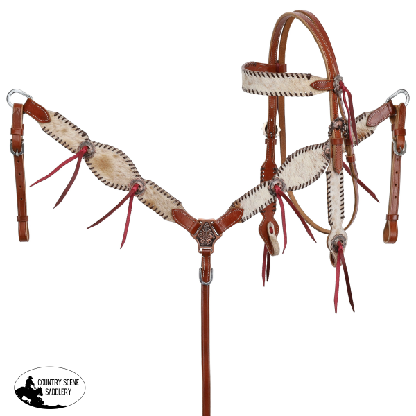 Showman ® Medium Oil Cowhide inlay one eared headstall and breast collar set with black rawhide lacing. This Set is accented with latigo ties, copper conchos, and hardware. Headstall comes with 5/8" x 7' leather split reins.