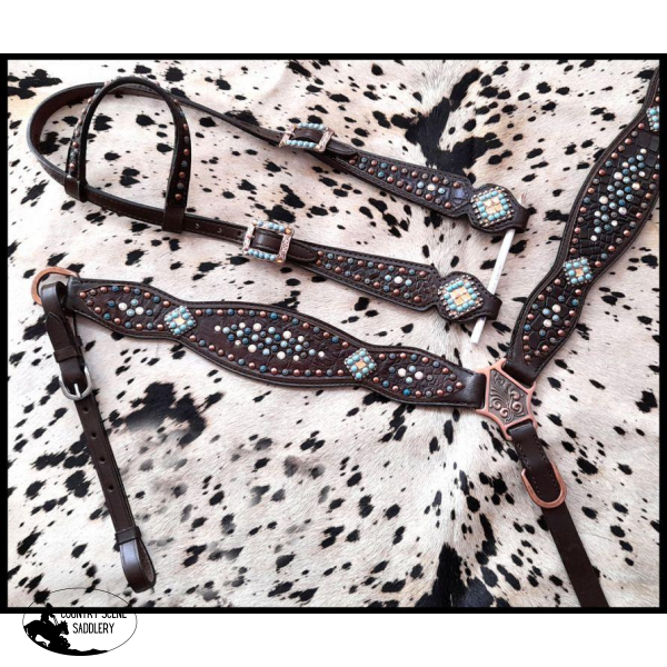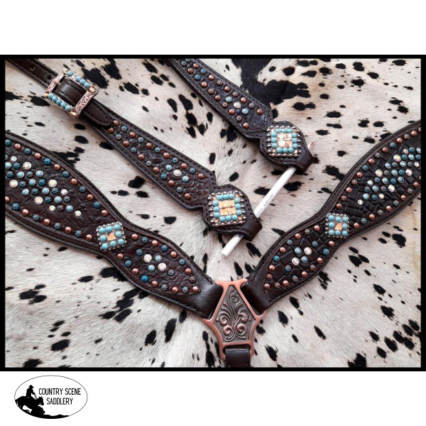 Showman ® Gator print inlay one ear headstall and breast collar set with turquoise, and copper beading. This set features dark leather with a gator inlay. Set is accented with turquoise and crystal rhinestone Conchos, turquoise and copper beads. Headstall comes with 5/8" x 7' leather split reins.