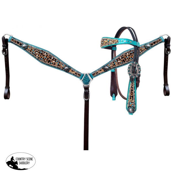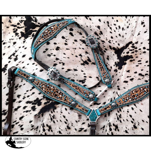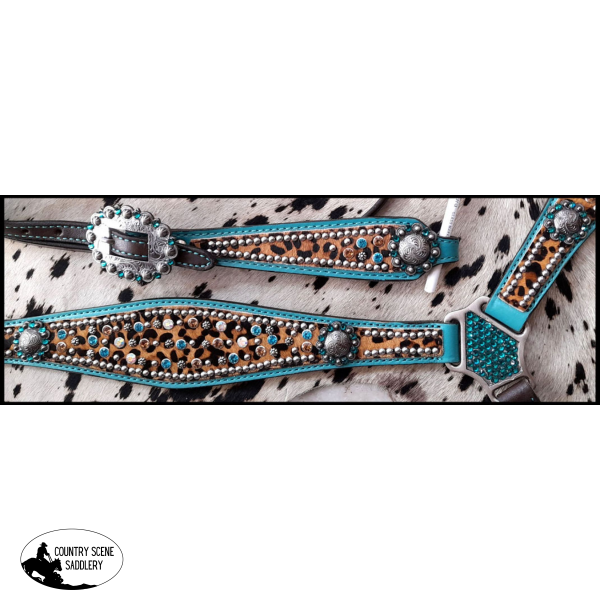 Showman ® Hair on Cheetah inlay with metallic teal accent browband headstall and breast collar set with beads and engraved conchos and hardware. This set features dark leather with a hair on Cheetah print inlay. Set is accented with a metallic teal accent and beading and engraved Conchos. Headstall comes with 5/8" x 7' leather split reins.