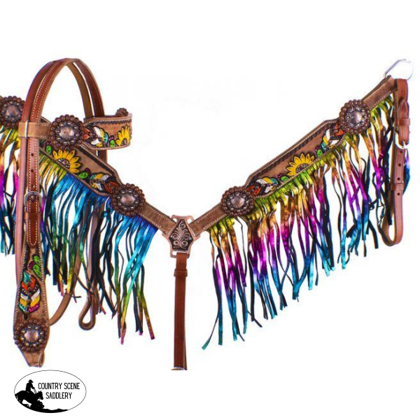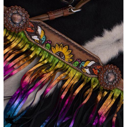 with Metallic Rainbow Fringe. This set features a medium colored leather with hand painted feathers, sunflowers and cactus' on breast collar, brow band, and cheeks. Breast collar features metallic rainbow fringe and is accented with round copper conchos. Set comes complete with 5/8" x 7' split leather reins.