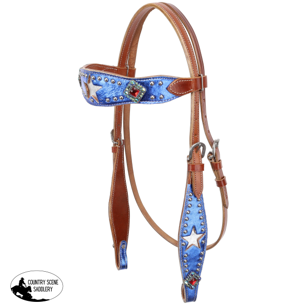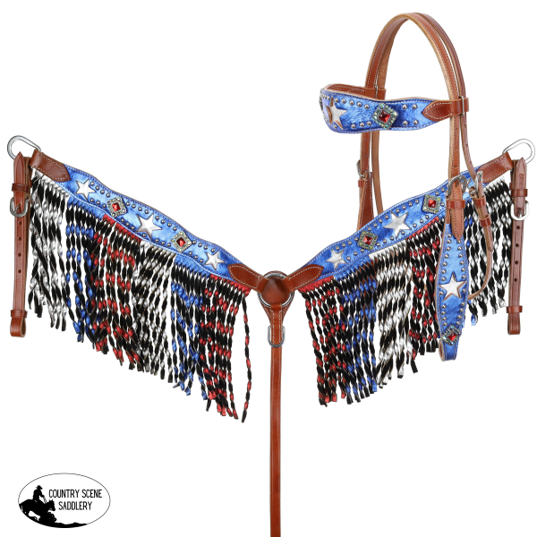 This show-stopping tack set brings together the rugged charm of medium oiled leather with the flash of metallic blue overlays, silver stars, and dazzling red, silver, and blue fringe for a look that's as fearless as you are. Whether you're celebrating the Fourth, riding in a parade, or just showing off your American spirit, this set was made to shine.