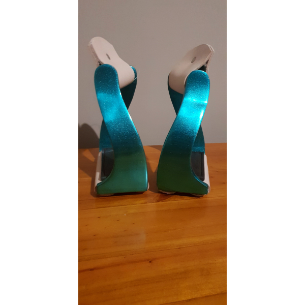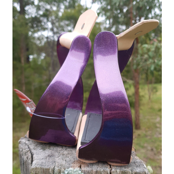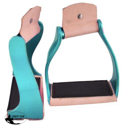 Showman ®Lightweight color coated twisted angled aluminum stirrups. Bottom of stirrups are wrapped in light leather with a black rubber tread. These stirrups take the pain out of breaking in fenders. Neck is twisted to allow your feet to stay straight against the horse with out pressure on your ankle.