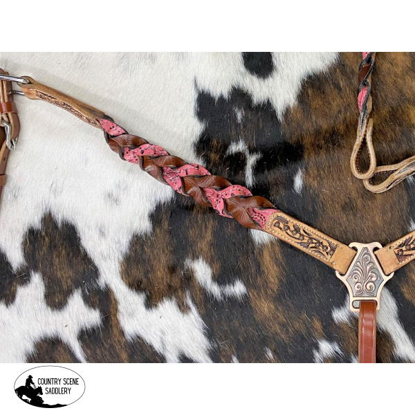 Showman ® Miracle Braid One Ear Headstall and Breast Collar Set. This medium brown leather headstall and breast collar set features pink filigree miracle braid. The set is accented with leaf tooling, stainless steel hardware, copper berry buckles, screw bit ends, and silver studs. Set comes complete with matching headstall, breast collar, and 5/8" x 7' leather split reins.
