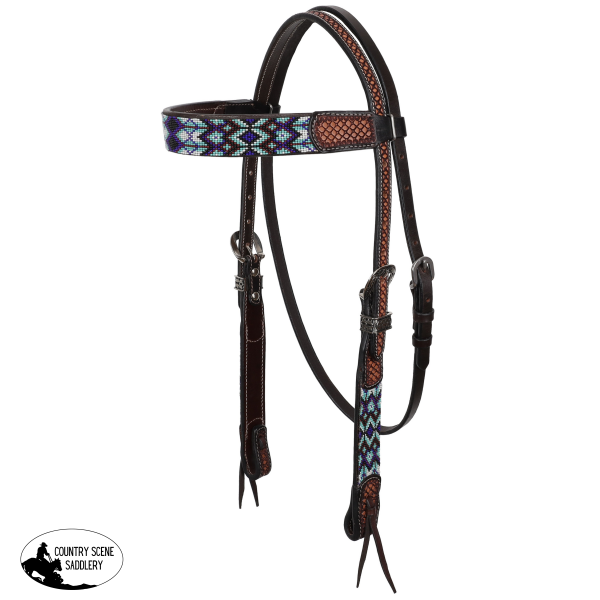 Teal, blue, white, and black Southwest beaded inlay on browband and cheeks