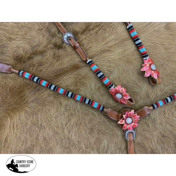 Showman ® One Ear beaded Headstall and Breast collar Set w/ 3D leather flower accents. This set features a medium colored leather with Aztec beaded overlay in red, teal & black w/ 3D flower accents. Set comes complete with 5/8" x 7' split leather reins