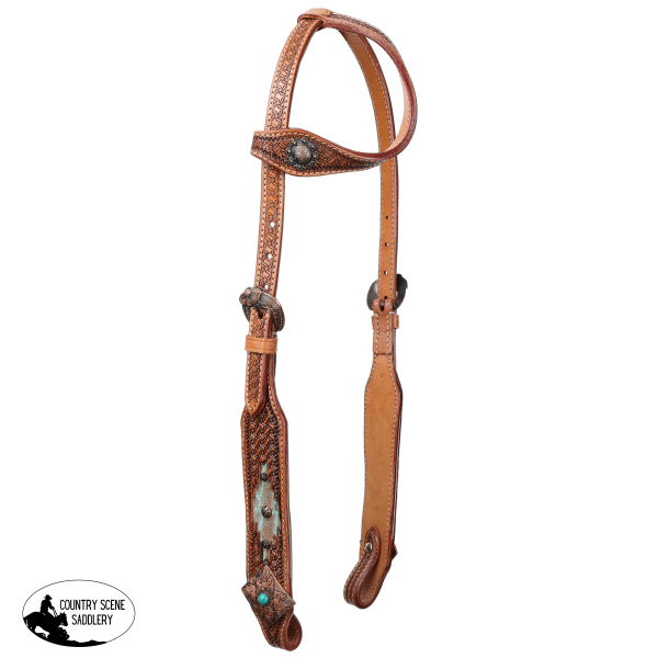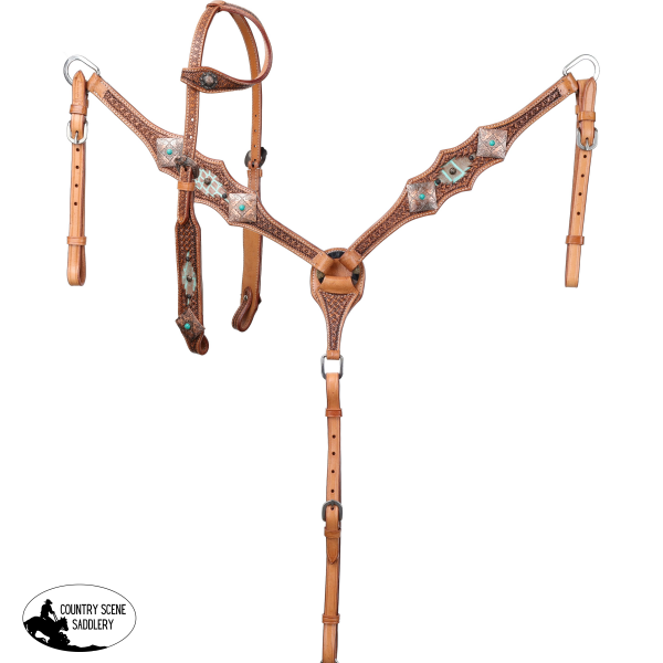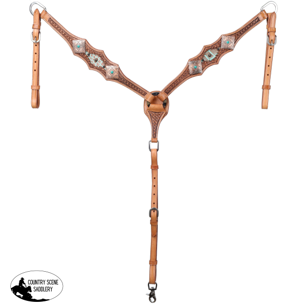 Make a bold statement in the arena or on the trail with the Showmanยฎ Outlaw Oasis One Ear Headstall and Breastcollar Set. Crafted from medium-oiled, high-quality leather, this set features hand-tooled basketweave accents paired with striking turquoise and brown gator print inlays on the cheeks and breastcollar. Large engraved copper square conchos with turquoise centers add eye-catching contrast and western character.