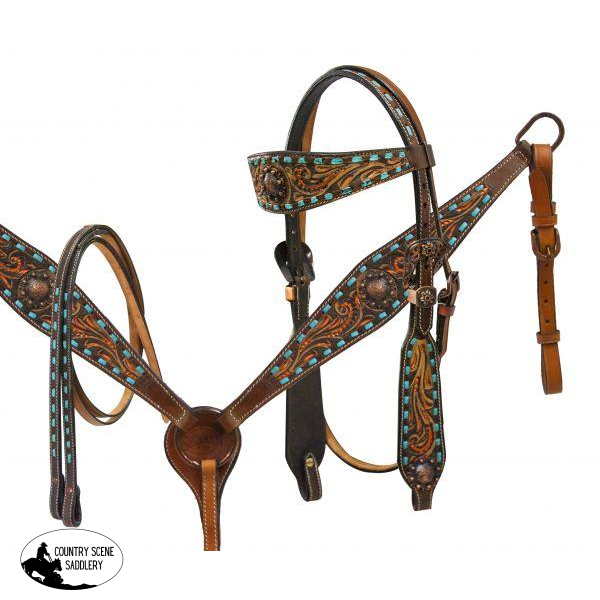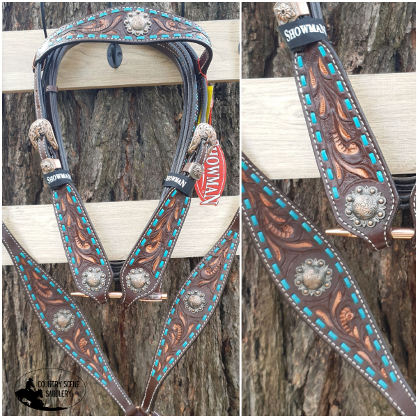 Showman ® Teal buck stitched headstall and breast collar set with engraved bronze conchos. This set features dark oil leather with copper painted floral tooling accented with teal buck stitch and engraved antique bronze conchos and hardware. Headstall comes with matching 5/8" x 7' leather split reins.Matches halter #7710 Pre Order