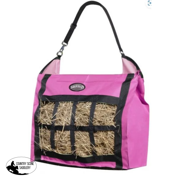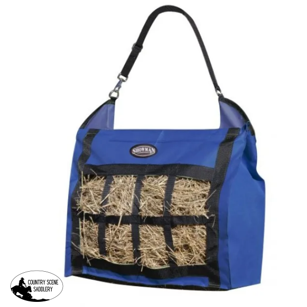 The Showmanยฎ Slow Feed Hay Tote is designed to make feeding easier, cleaner, and more efficient whether you're at the barn, on the road, or heading to a show. Crafted from durable heavy-duty nylon, this tote features a large capacity opening with covered bars for added stability, making it simple to fill and carry. The adjustable nylon strap with clasp allows for convenient hanging in a variety of settings.