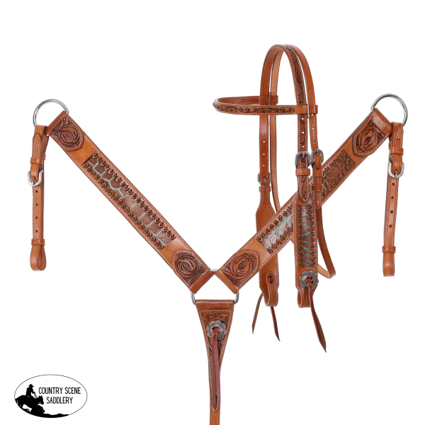 The headstall features dual adjustable cheeks, allowing for a customized fit that ensures comfort and stability during rides. Accented with stylish studs, the dual adjustable cheeks enhance the overall aesthetic while providing practicality. The antiqued slotted floral conchos add a touch of vintage charm, beautifully contrasting with the vibrant teal inlay. Additionally, the leather tie bit connection provides a secure attachment point, ensuring that the bit remains in place while riding. This combination of features makes the headstall not only visually appealing but also reliable for everyday use.