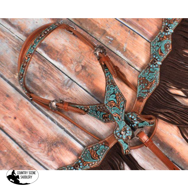 Showman ® Turquoise and Brown Floral Tooled browband headstall and breast collar set. This set features medium double stitched leather accented with a turquoise and brown hand painted floral tooled design and accented with turquoise stone horseshoe conchos and engraved silver studs. Breast collar is accented with chocolate brown suede leather fringe and horseshoe center chest plate. Headstall comes with 5/8" x 7' leather split reins. PRE ORDERS USAWe're really sorry...