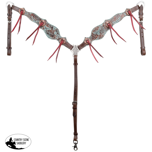 The slotted copper conchos with burgundy leather tie accents on the breastcollar add depth and detail, while the large copper buckles on the headstall bring a flash of shine to the rustic design. With adjustable cheeks, tugs, and center strap, it’s built for both comfort and function.