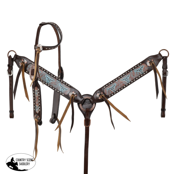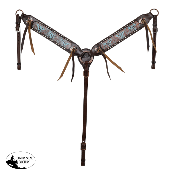 Inlays: Intricate weathered leather design with turquoise and rust steer head accents.