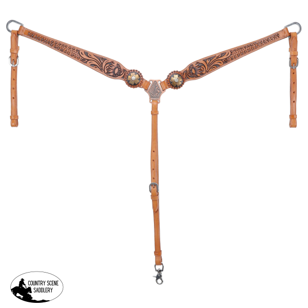The set is accented with antiqued conchos adorned with copper flower centers, bringing warm, vintage charm to your gear. The cheeks adjust easily with antiqued silver and copper bar buckles, ensuring a secure and comfortable fit for your horse. The breastcollar features adjustable tugs and a center strap, allowing you to fine-tune the fit for stability and style. Comes complete with matching leather reins, so you're ready to ride in style from the moment you tack up.