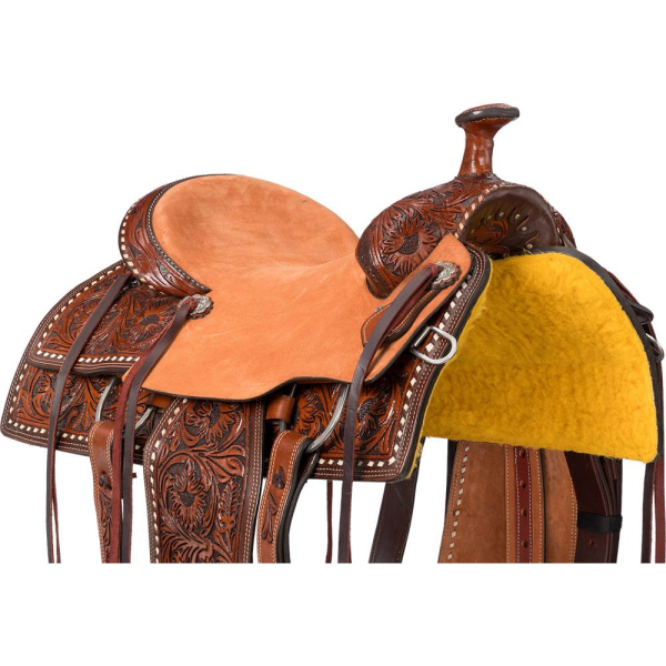 Bring timeless style to your ride with this beautifully detailed western saddle. Featuring a two-tone floral tooled design accented by a crisp white buckstitch border, this saddle offers both classic looks and modern performance. The roughout seat and jockeys provide extra grip and security, keeping you steady during any type of riding. A squared-off skirt and fenders complete the distinctive design.