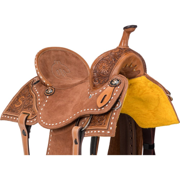 Bring home the big bucks with the CA$H Barrel Saddle from Silver Royal. Crafted on a rawhide-wrapped fiberglass tree, this saddle features a deep suede seat with embroidered dollar sign detail. A bold, white buckstitch edge adorns the pencil roll cantle, jockeys, and skirt, which are suede for ideal grip. Beautiful hand-tooled floral corner overlays pair perfectly with dark antique dollar sign conchos. Complete with angled aluminum stirrups and includes a rear cinch.