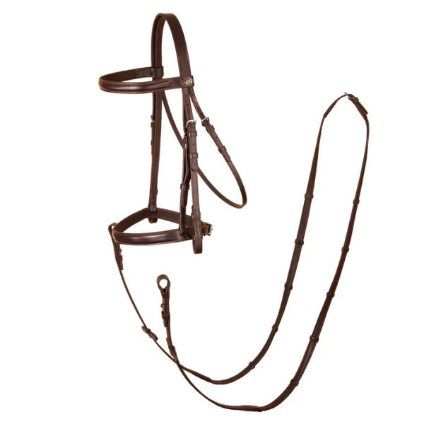 It features an elegant noseband & browband that is slightly raised with fine stitching detail, neat cheek pieces, and padded reins.